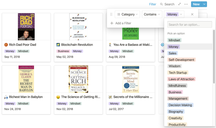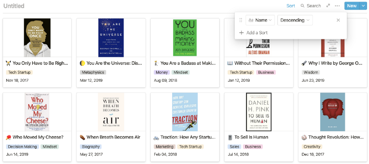 Khi tạo một bảng với dữ liệu bất kỳ, Notion sẽ cung cấp cho người dùng bộ lọc và sắp xếp theo các thuộc tính đã tạo. Nên bạn có thể dễ dàng tìm kiếm một cuốn sách dựa trên những thông số đã tạo trước đó như: tên sách, thể loại, tiến độ, ngày hoàn thành…